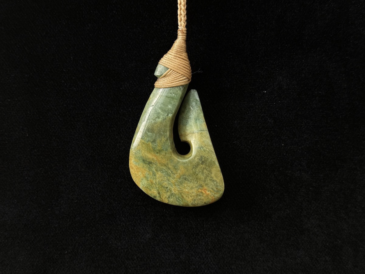Dieses schöne Unikat stammt aus der Hand eines uns gut bekannten Künstlers der Maori. Der klassich geformte Fischhaken besticht durch seine grün-gelb gemaserte Blumenjade in Edelsteinqualität und die ebenso schöne Verarbeitung.