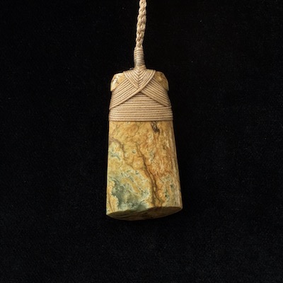 Die Marsden Flower Jade ist eine bei den Schmuckschnitzern der Maori äußerst begehrte und prominente Jade, die so wie bei diesem Taonga durch ihre besondere gelbe Farbgebung auffällt.