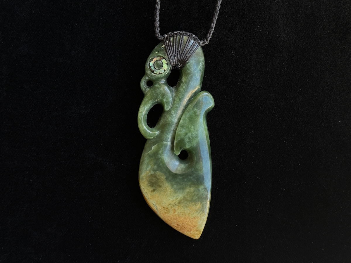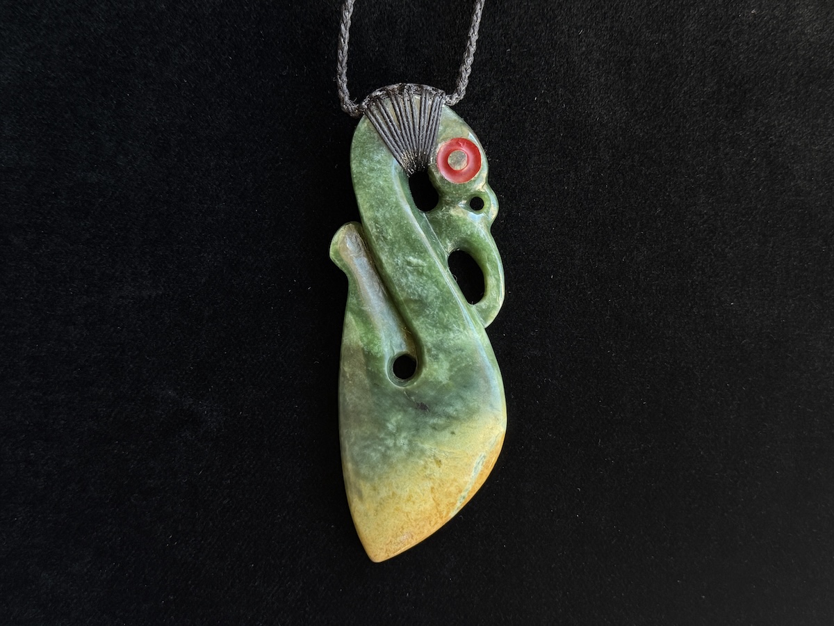 Wenn das nicht ein echter Schatz (Maori:”Taonga”) ist. Dieses beeindruckende, klassiche Manaia stammt aus der Hand eines uns gut bekannten Künstler der Maori. Es besticht durch seine Größe. die perfekten Proportionen und die grüne-gelbe Blumenjade in Edelsteinqualität!