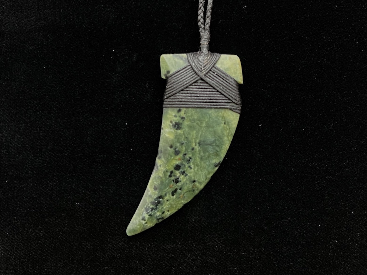 Dieses schöne Unikat stammt aus der Hand eines angesehenen Schnitzmeisters der Maori. Es besticht durch die schöne Form und die gemusterte Kawakawa-Jade.