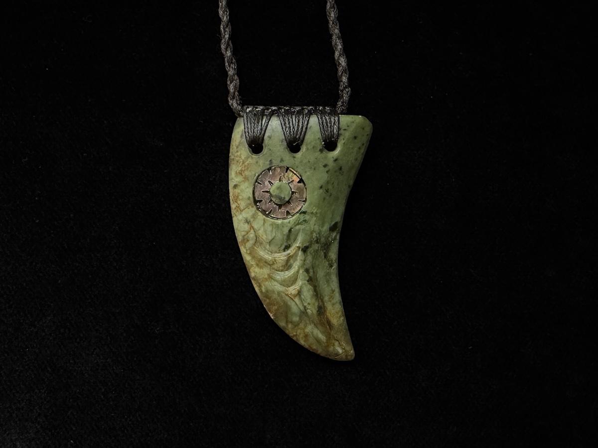 Dieses schöne Unikat stammt aus der Hand eines angesehenen Schnitzmeisters der Maori. Es besticht durch die mehrfärbige Jade und die Verzierung mit einem Auge aus Pauamuschel.