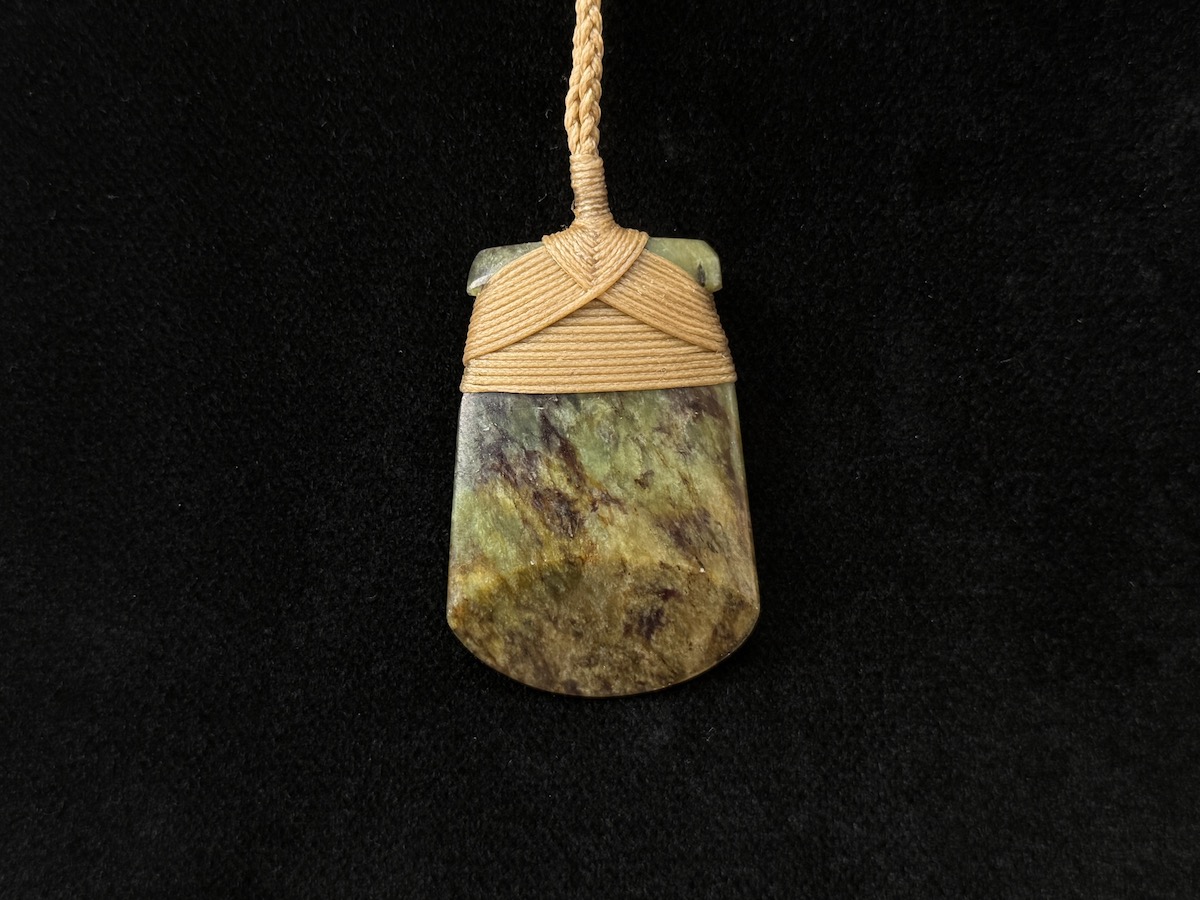 Dieses zeitlose schöne, klassische Toki stammt aus der Hand eines uns bekannten Meisters der Maori-Steinkunst. Es besticht durch seine Formschönheit und die außergewöhnliche, mehrfärbige, gesprenkelte Jade.