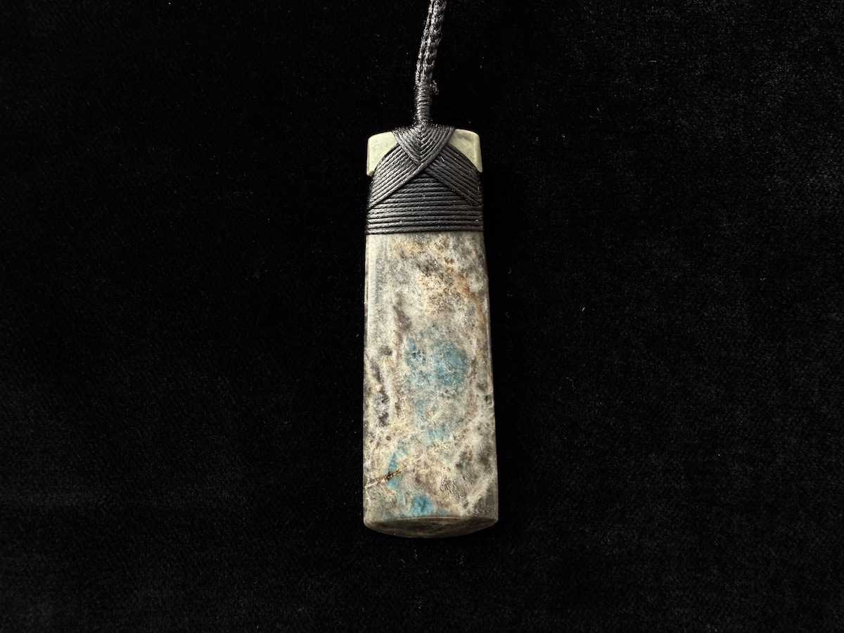 Dieses ungewöhnliche Taonga stammt aus der Hand eines uns gut bekannten Künstlers der Maori. Es besticht vor allem durch den schönen Aotea-Stein in einer interessanten Mischung aus grau und hellblau.