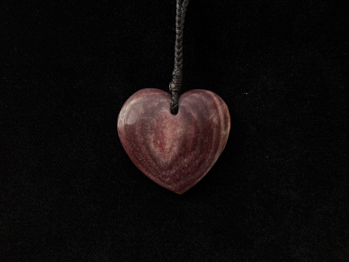 Dieses schöne Herz stammt aus der Hand eines uns bekannten Meisters der Maori-Steinkunst. Es besticht durch einen tief dunklen, sehr schön gemaserten Aroha-Stein mit Glimmer.