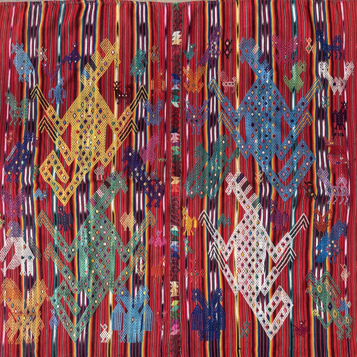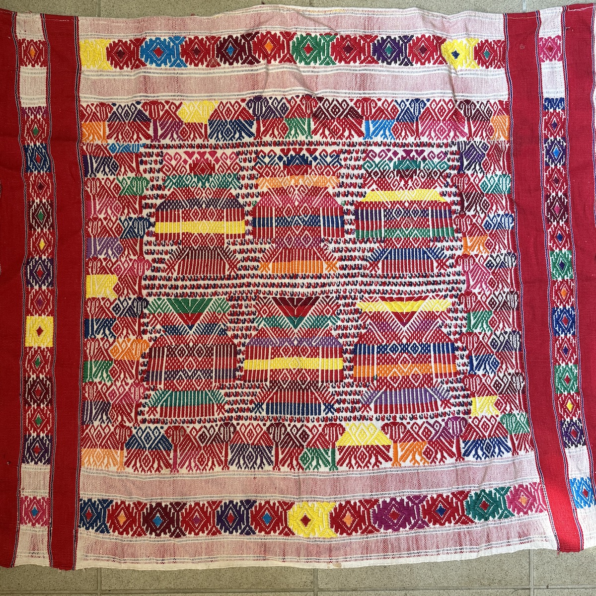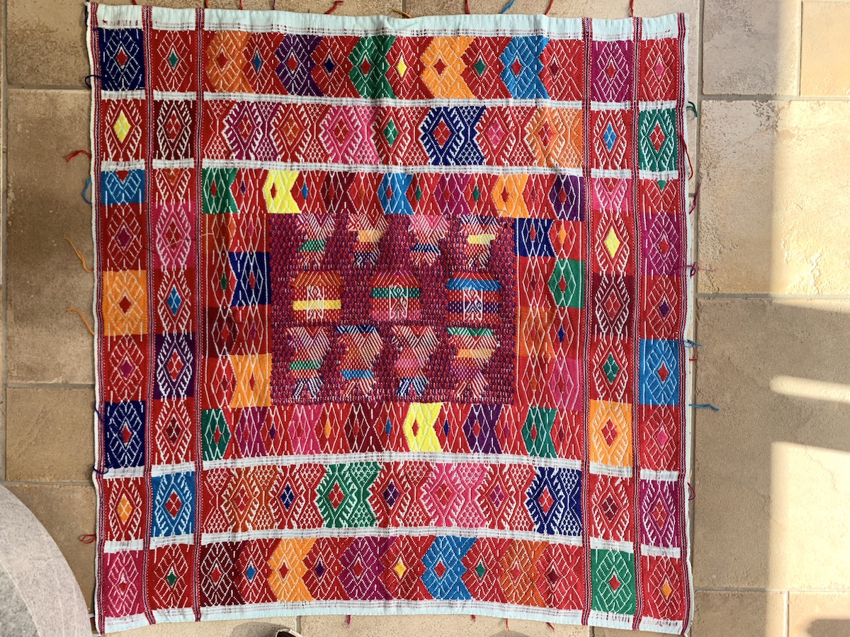 Aufgrund der Handarbeit und des Alters der Tzutes können diese leichte Unregelmäßigkeiten in Farbe, Form und Stoff sowie auch Nutzungsspuren aufweisen. Das Material ist Baumwolle.