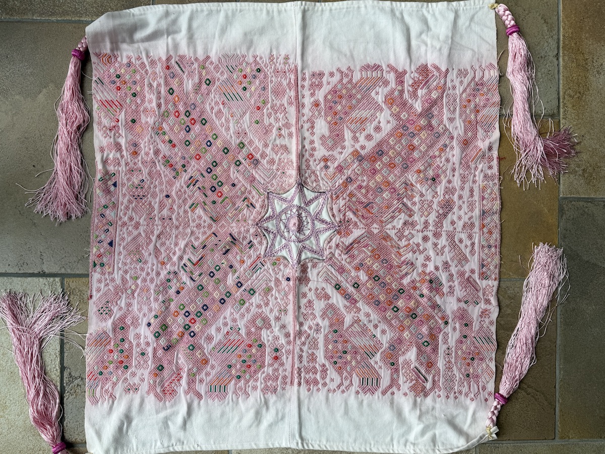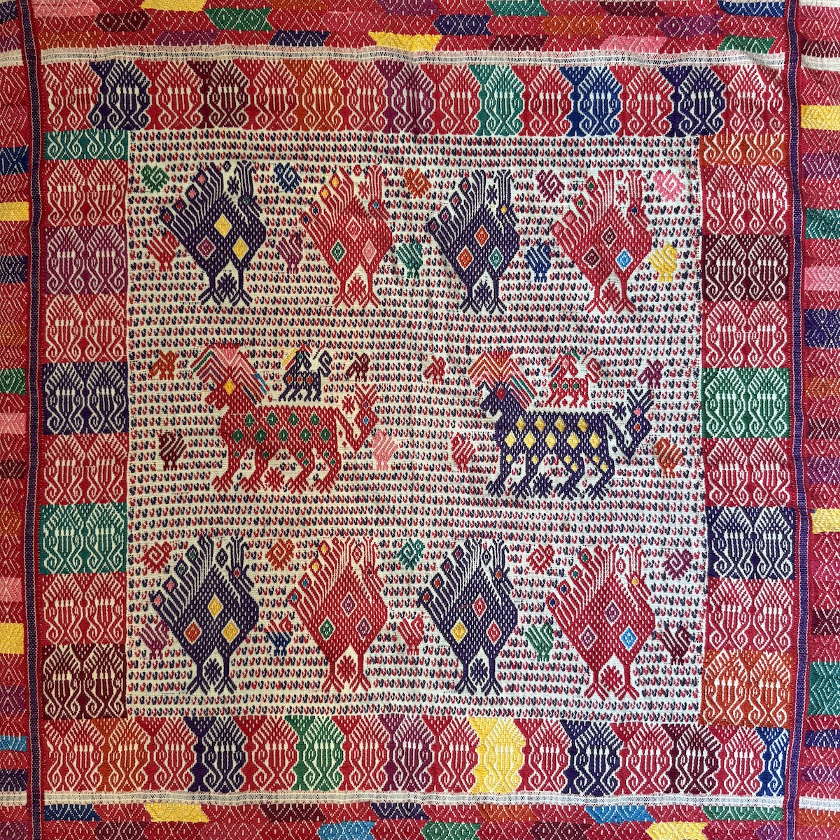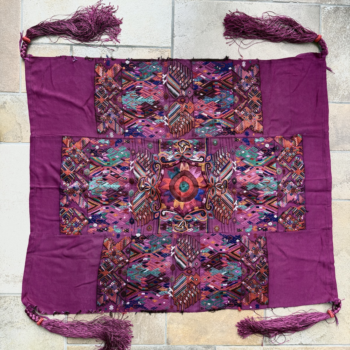 Aufgrund der Handarbeit und des Alters der Tzutes können diese leichte Unregelmäßigkeiten in Farbe, Form und Stoff sowie auch Nutzungsspuren aufweisen. Das Material ist Baumwolle.